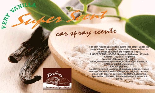 In the early 1990s, perfume makers began to introduce vanilla as a significant note in their fragrances. Now, vanilla is a dominant ingredient.Various attempts have been made to explain the current unprecedented popularity of vanilla-based fragrances. Many have tended to focus on the pleasant childhood memories associated with the smell of vanilla, its comforting milky warmth. Others have noted the appropriateness of vanilla scents for the softer, more caring zeitgeist of the past.Dafna uses the finest extract of Vanilla to make it's Very Vanilla Super Scent!Where Can Super Scent Be Sprayed?In the interior of cars, SUVs, trucks, limousines, buses, boats and more.Features:*Includes spray nozzle*eliminates unpleasant smells and odors*long-lasting water based car scent*conveniently packaged for ease of use*8 ounce bottleExperience it today!